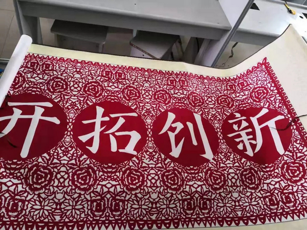 刘伟南常说:“雷同不是艺术,创新才是艺术。”直到现在,他在不停“折腾”些新东西,“去年我又创了两个新。”他告诉记者:“一个是把剪纸和毛笔书法相结合,一个是把剪纸和外文结合,剪纸上剪外文。”他还把抽象的学问、哲思也剪到纸花中,极大丰富了剪纸的表现力和文化内涵。