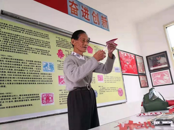 如今,已经年逾八十的刘伟南依然坚持每隔一段时间就到衡东县三樟中学教剪纸,合面折、点头折、跪折……剪刀灵巧地张合,再徐徐展开,千变万化的纸花就出现了。孩子们已经学了一段时间,大红“囍”字也能剪得有模有样了。